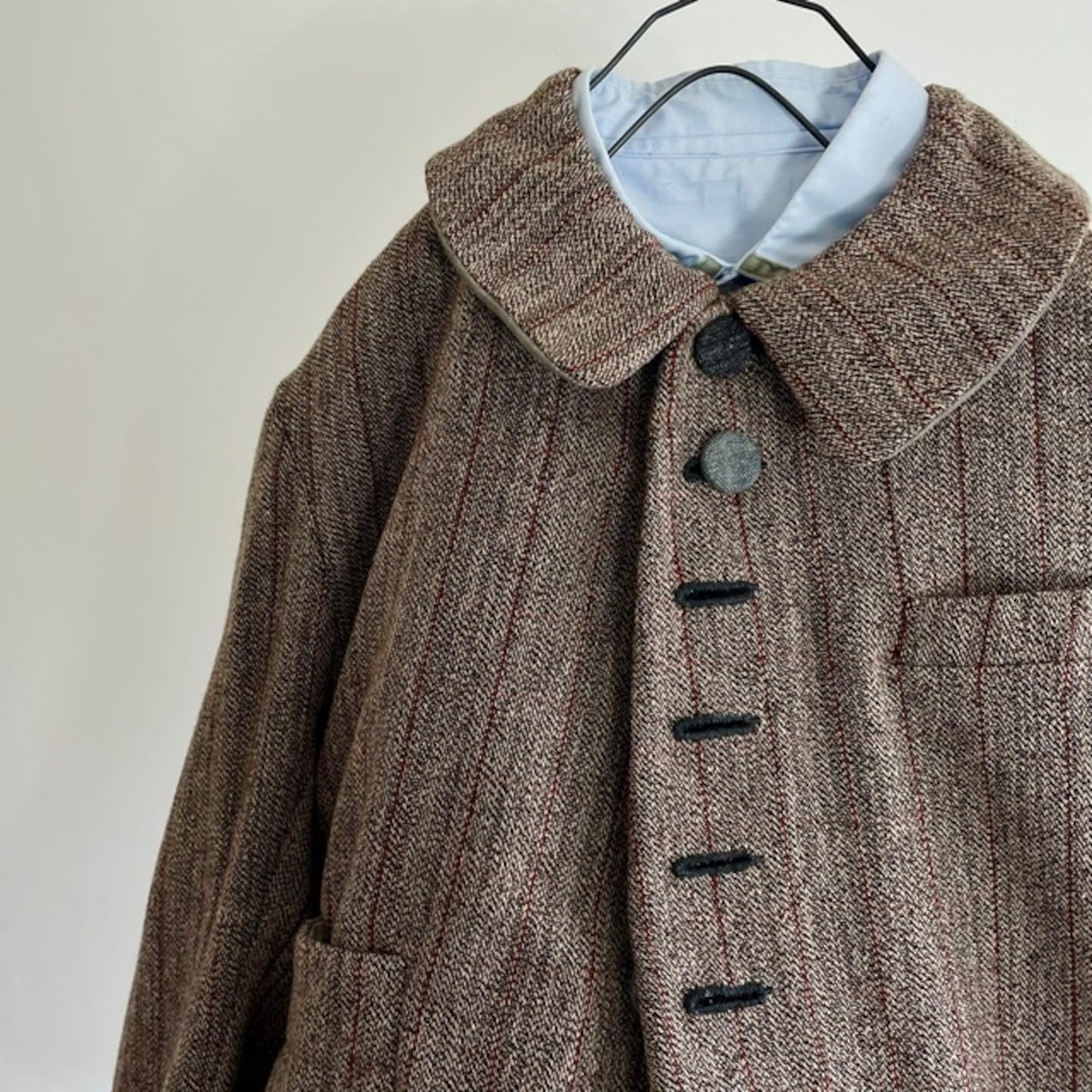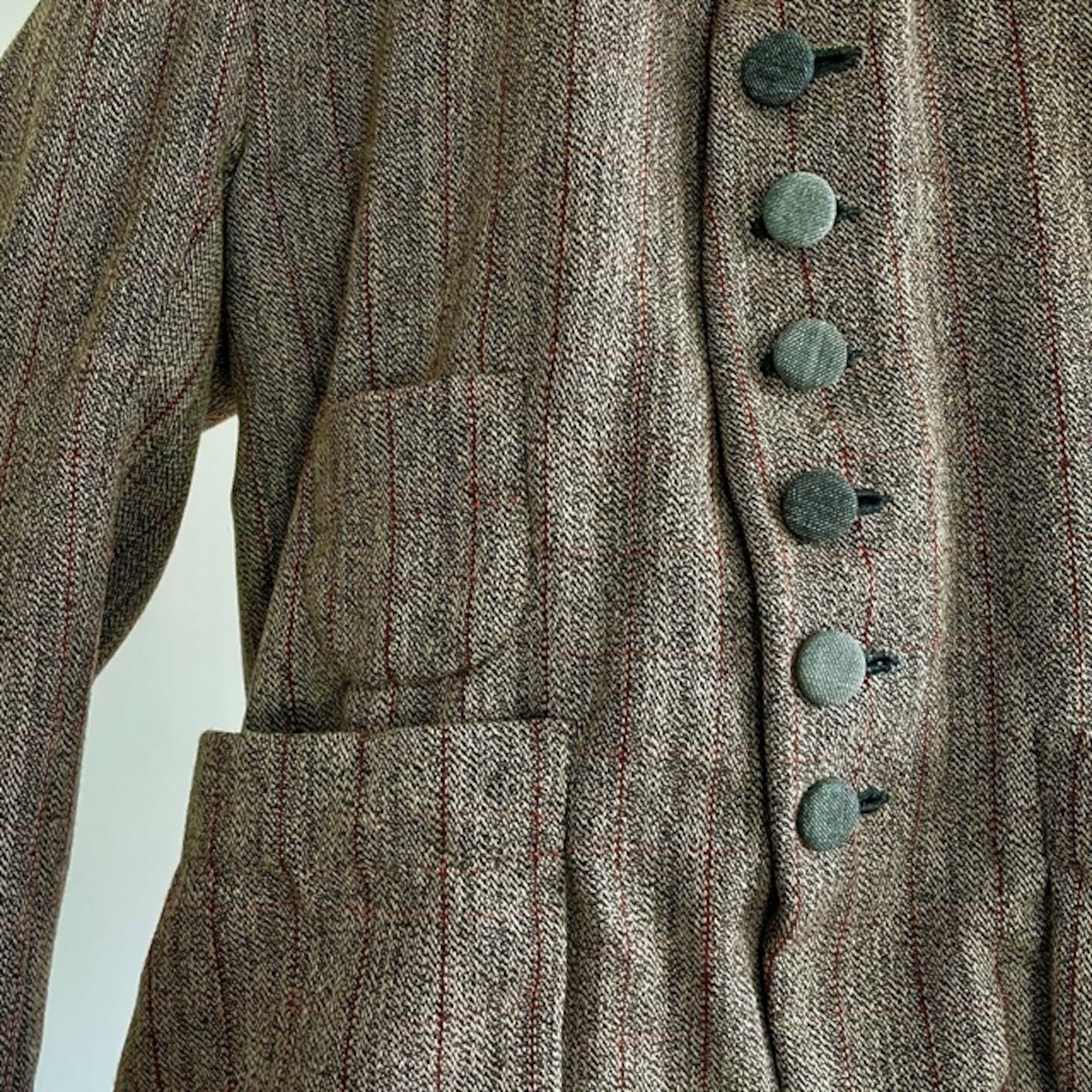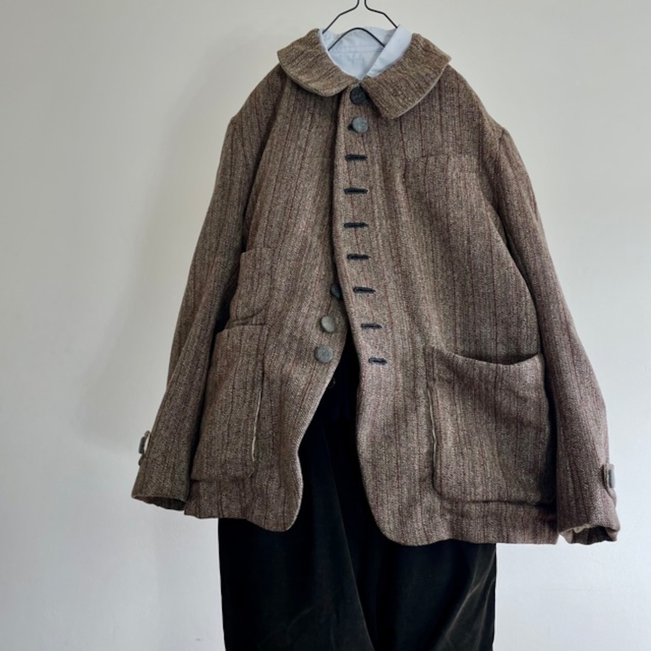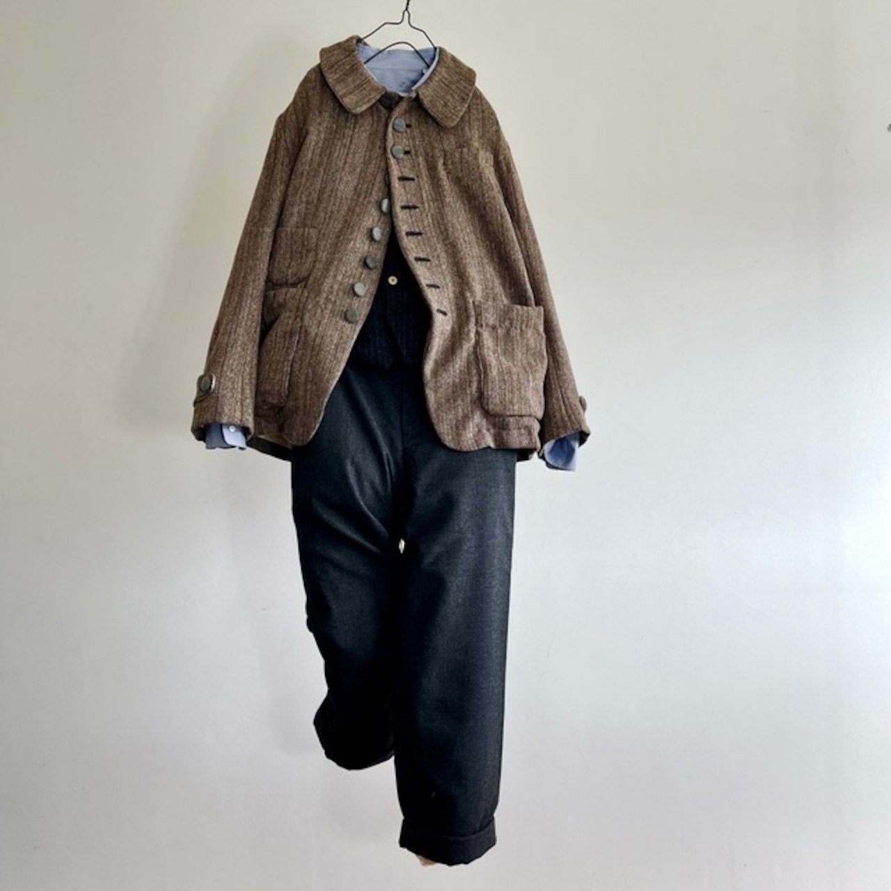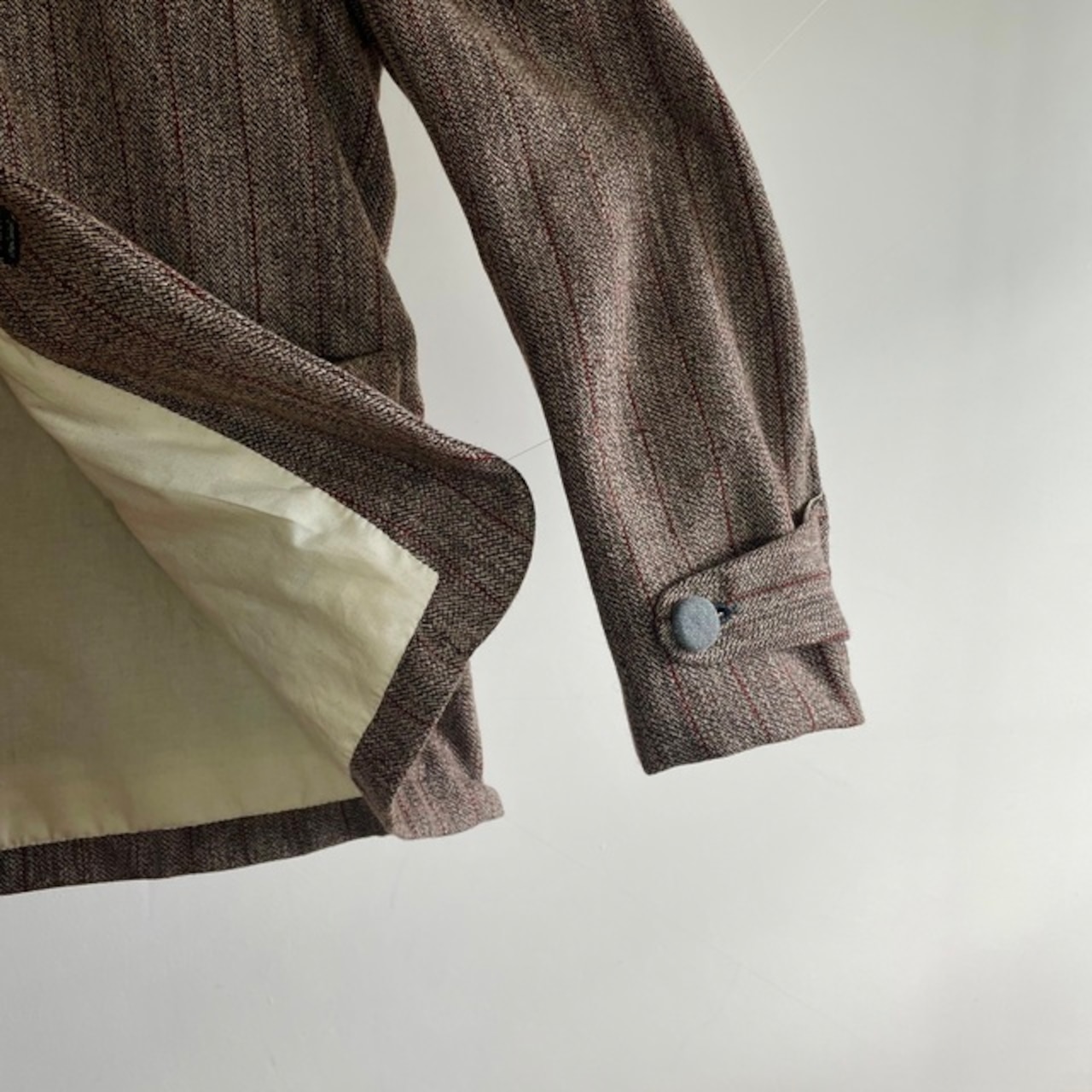 英国の頑健なツイードとはまた違ったフランスならではの風合いのツイードストライプと、フランスの仕事着のイメージを代表するsalt&pepperの生地で包んだくるみボタンの並ぶ味わいのあるジャケットです。