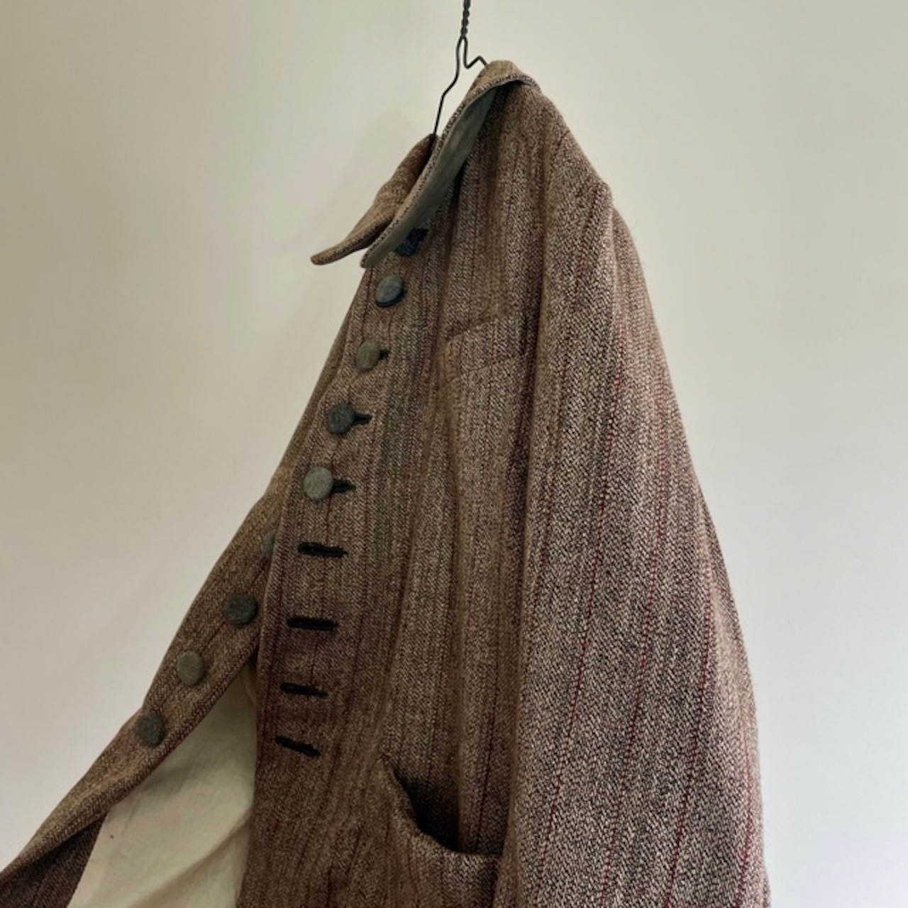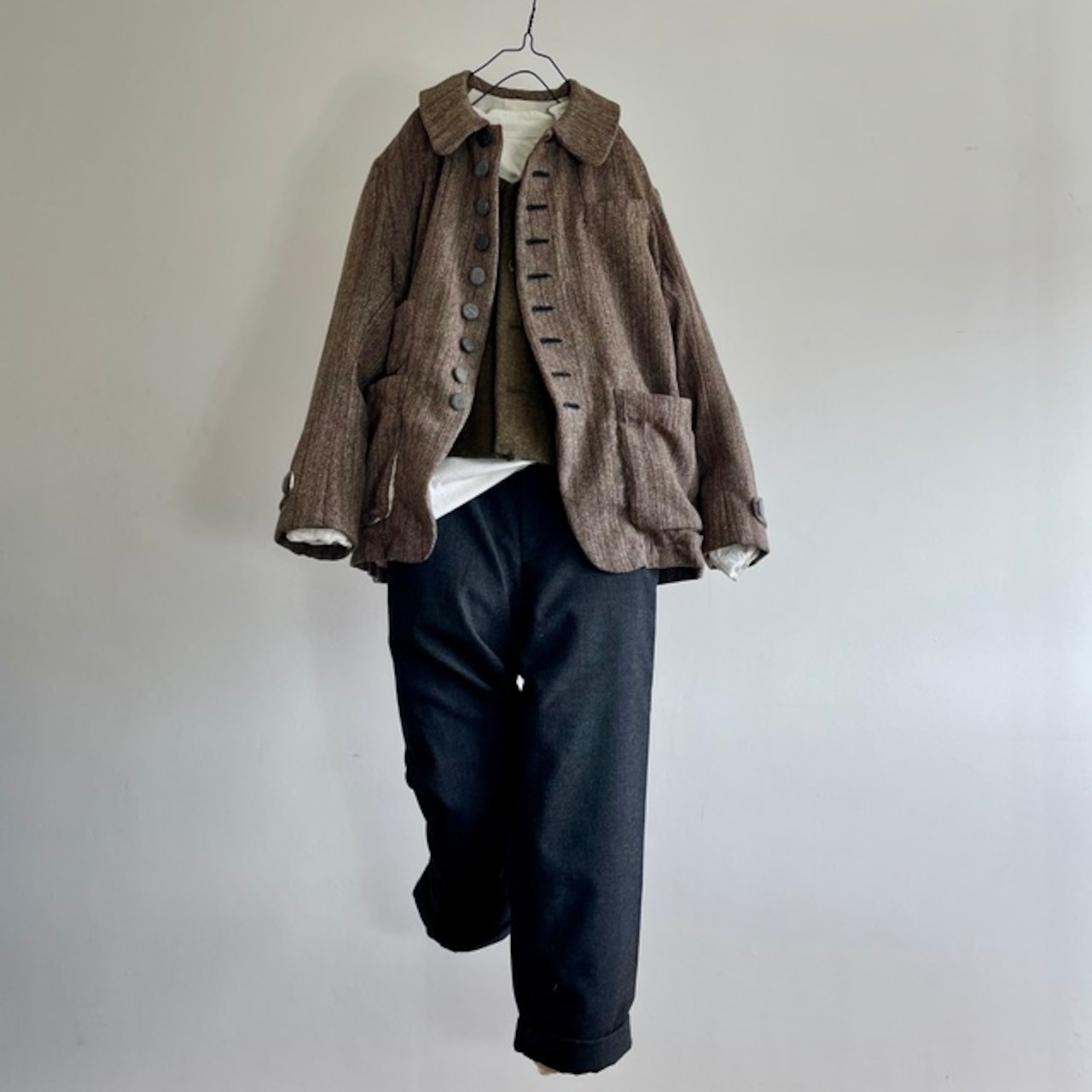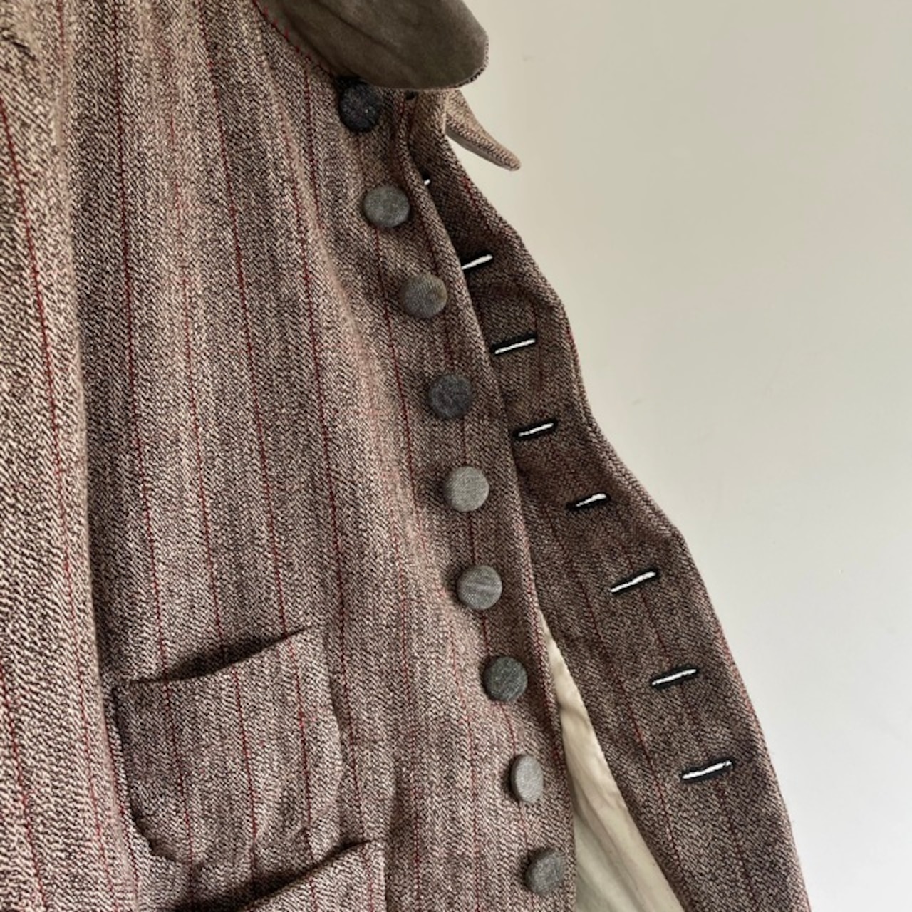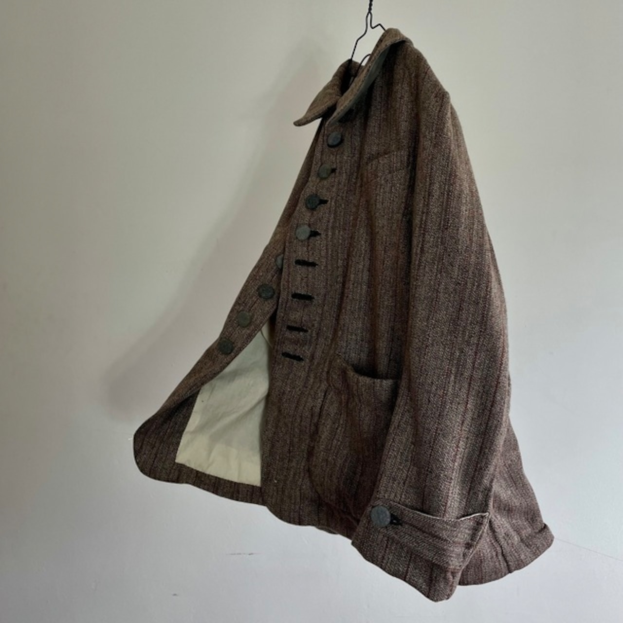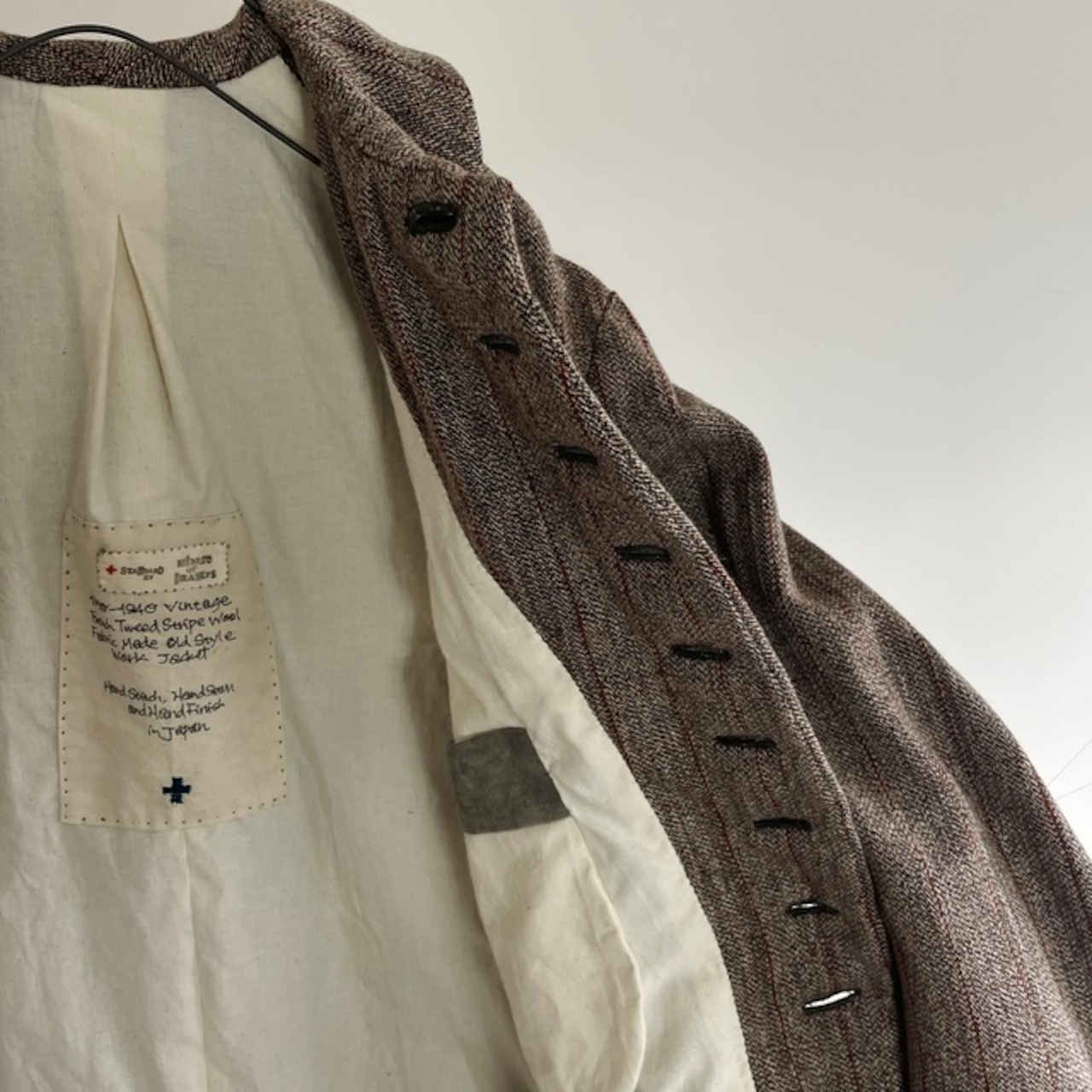 英国の頑健なツイードとはまた違ったフランスならではの風合いのツイードストライプと、フランスの仕事着のイメージを代表するsalt&pepperの生地で包んだくるみボタンの並ぶ味わいのあるジャケットです。