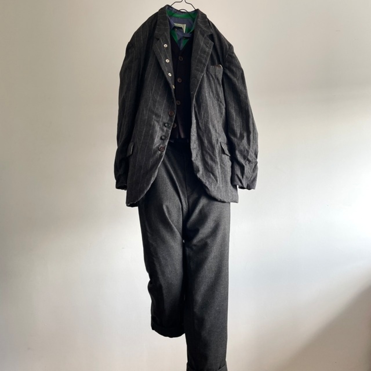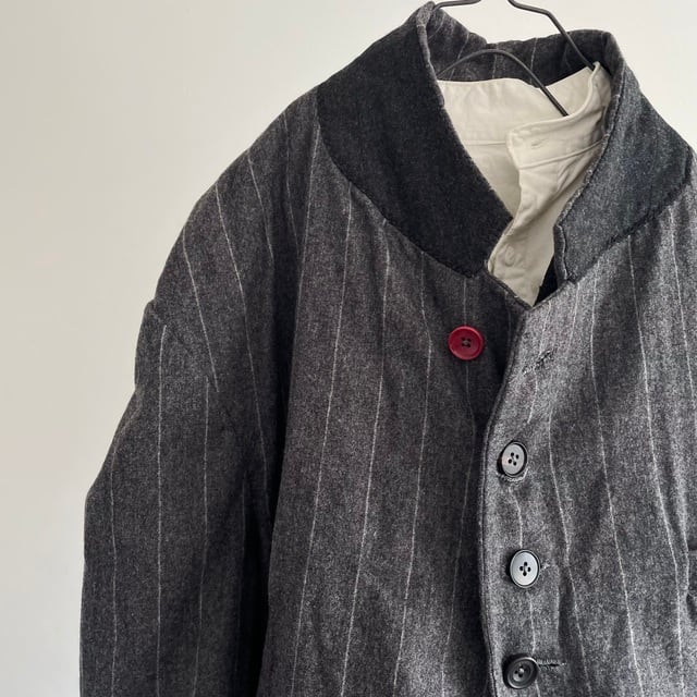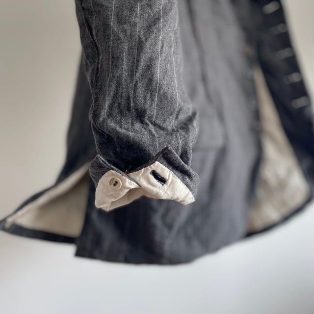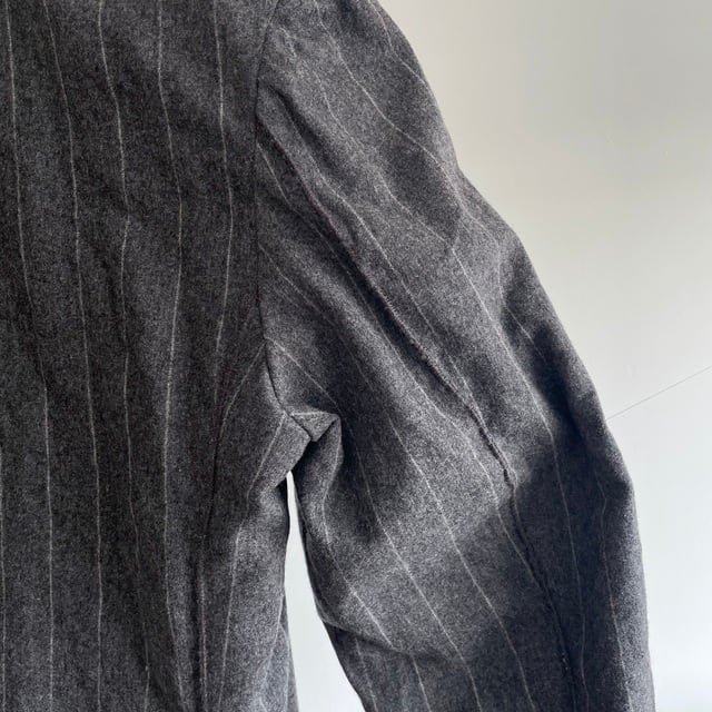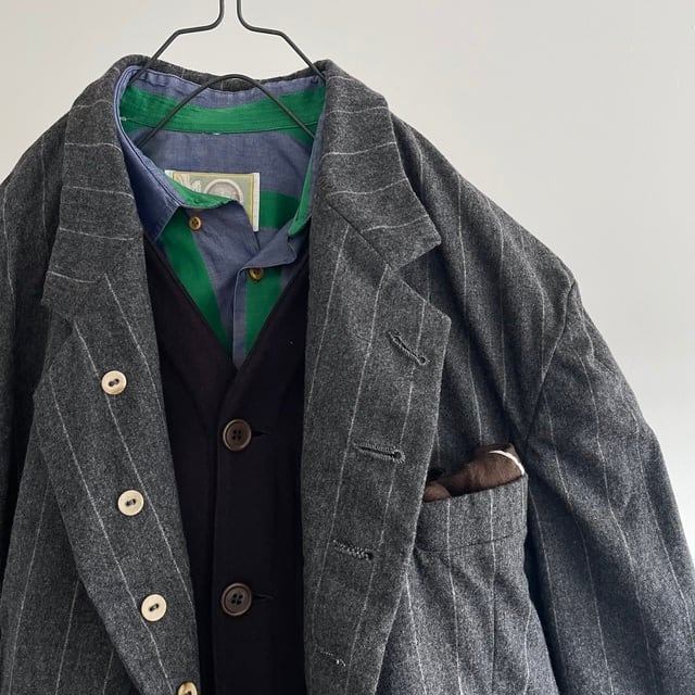 英国紳士のイメージが形になったような、上質で柔らかなミディアムグレーのウールフランネルのストライプジャケット。その上質なvintageに様々なALTERATIONを加えた、紙の上やデジタル画面の中からは、決して生み出されることのない一着です。