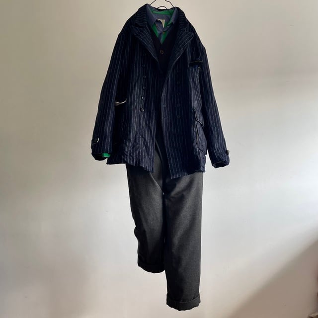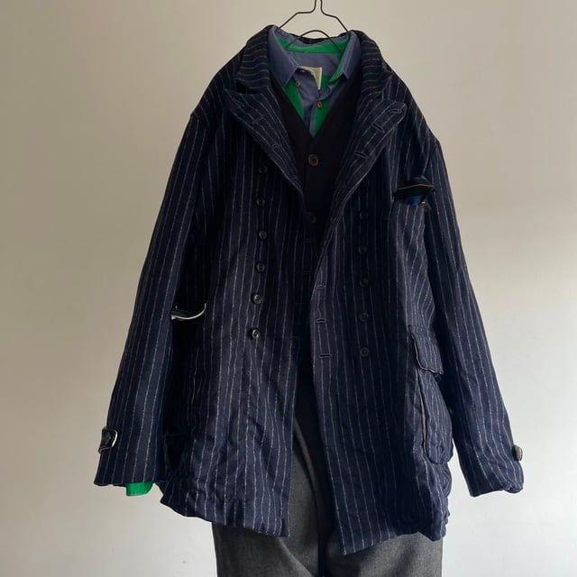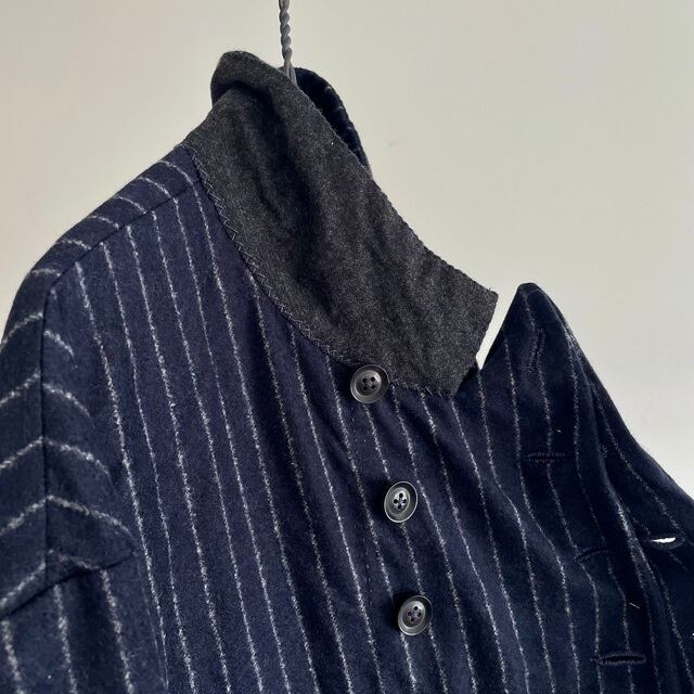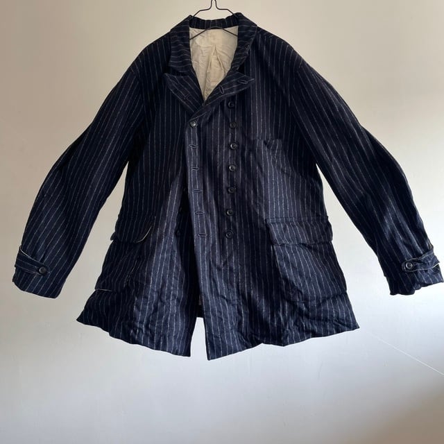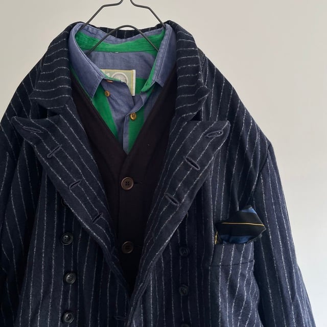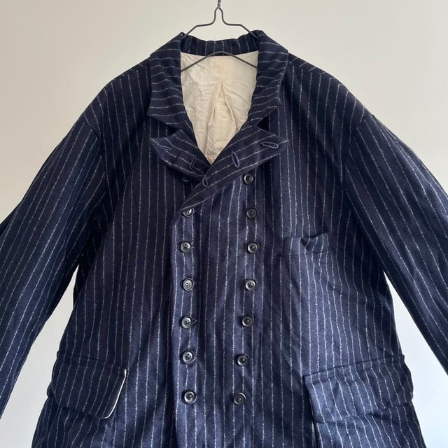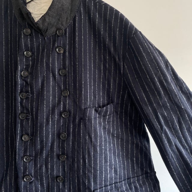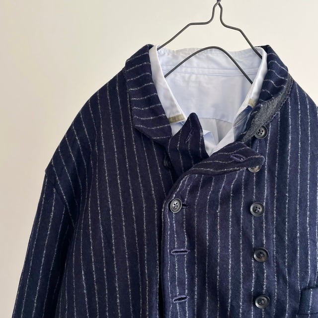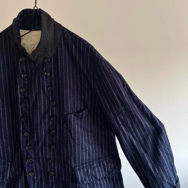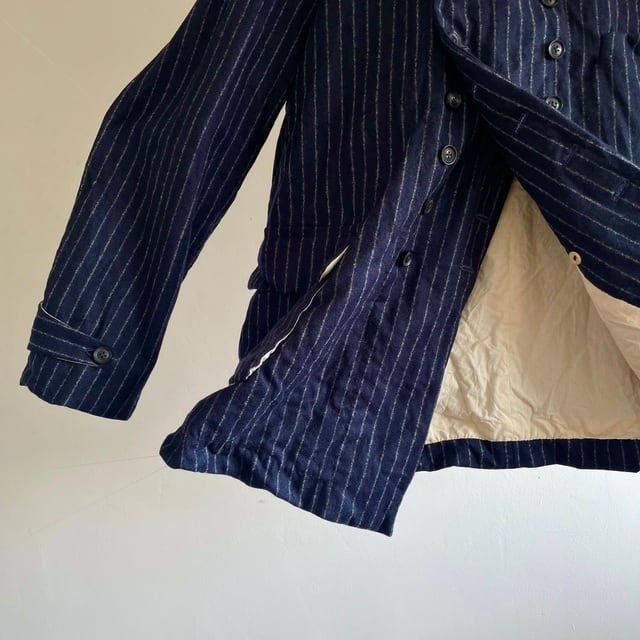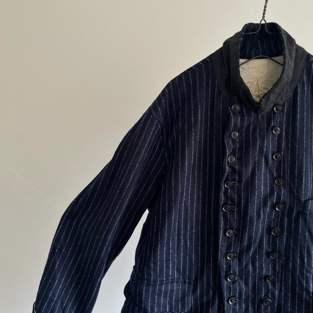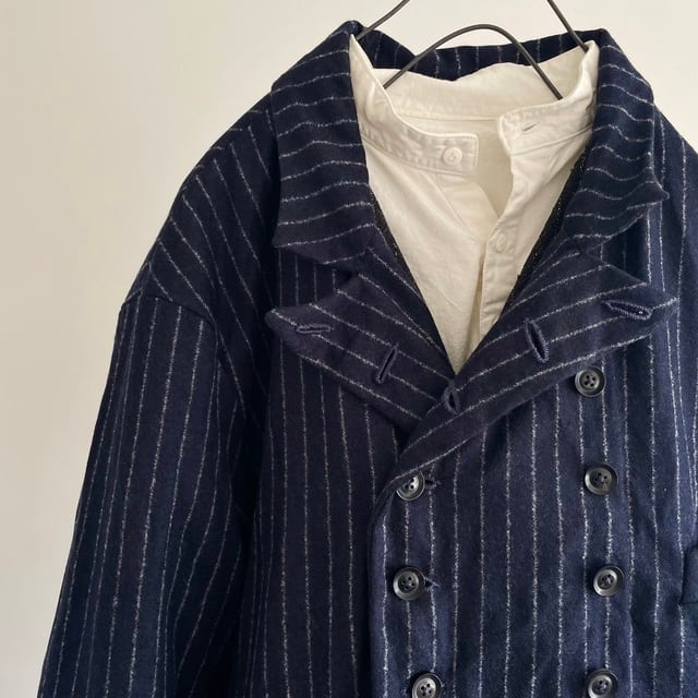 重厚さや上品さを象徴する英国生地のvintage、その中でも特に落ち着いた印象のネービーのチョークストライプのダブルブレストのコート/ジャケット。フランス海軍“Marine Nationale”の下士官のワークジャケットをモチーフにした、鋭角のピークドラペルの凛々しい襟周りの顔つき。数を増やして18個のボタンとボタンホールが描くリズムも個性的な表情です。