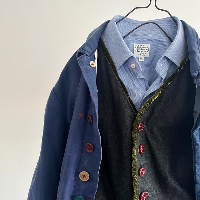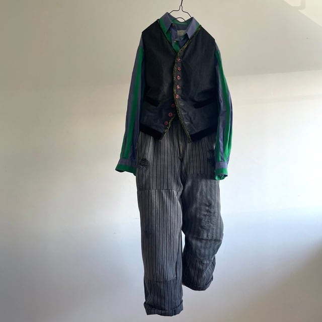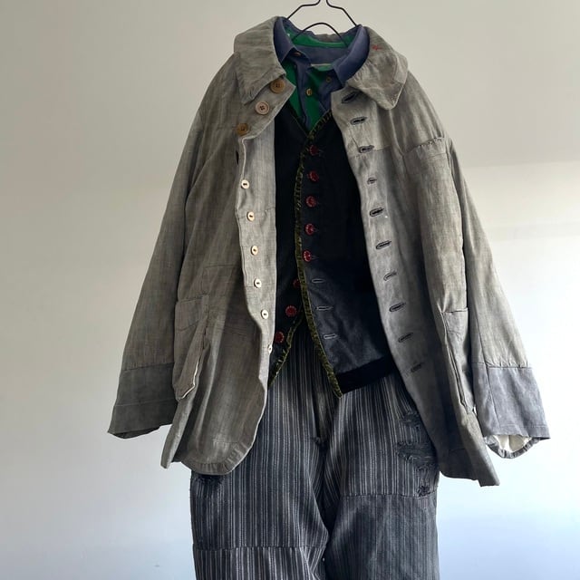 コンパクトな肩と身体に沿うフィット感のオーソドックスなフォルムのvintageのウールヘリンボーンストのGiletに、ベルベットのアクセントを加えた1枚です。