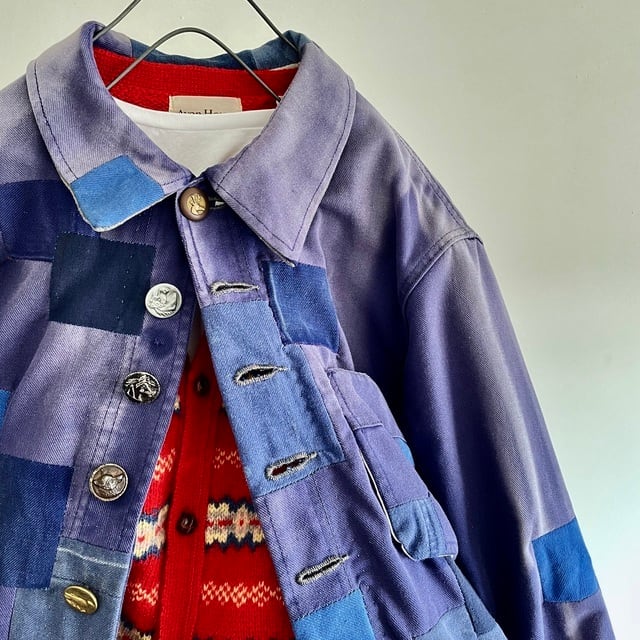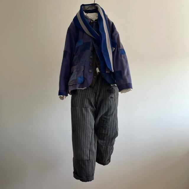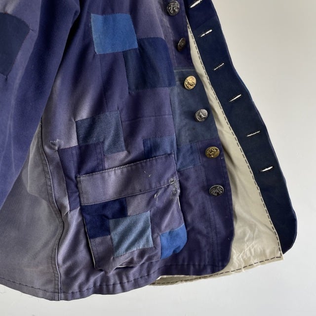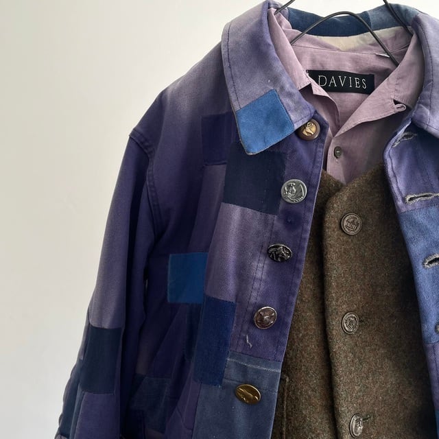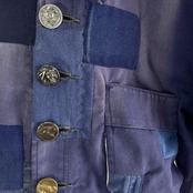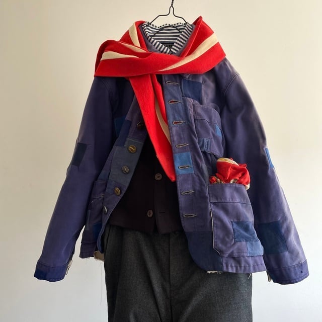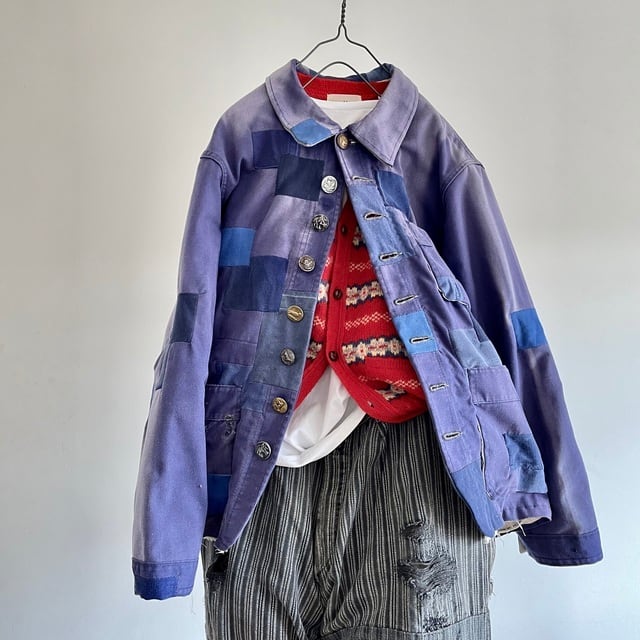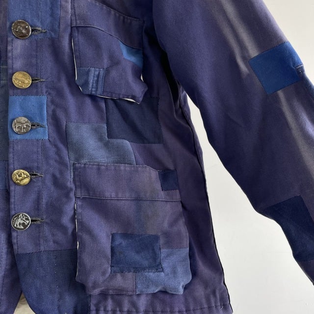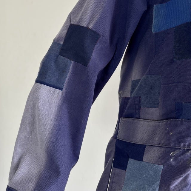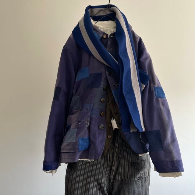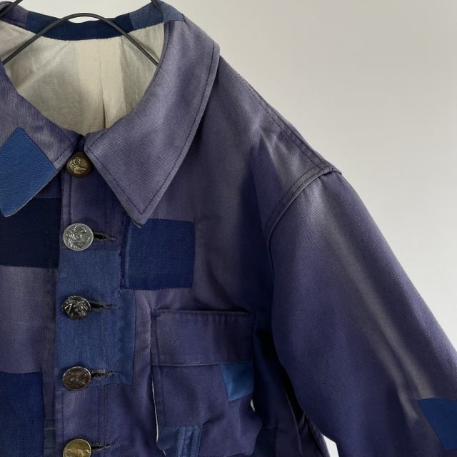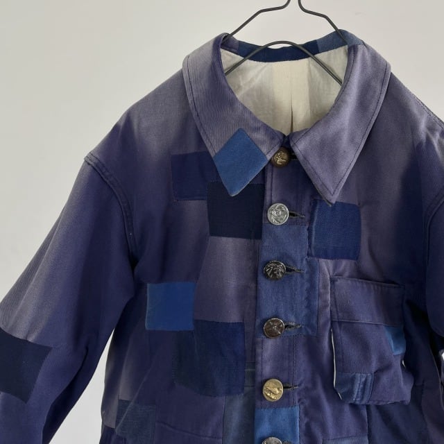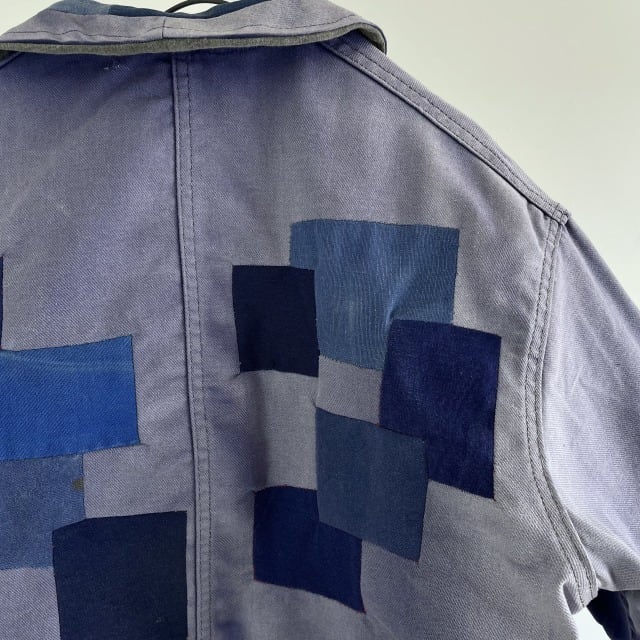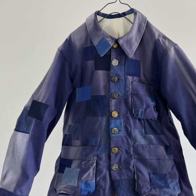 ワークウェアに用いられた、フランスの伝統的なさまざまなBlueの集積。擦られ、色褪せ、汚れ、色のくすんだvintageの、働く男たちの汗の証が集まったモザイクが美しい1着です。
