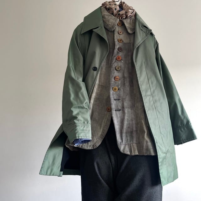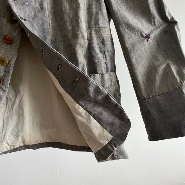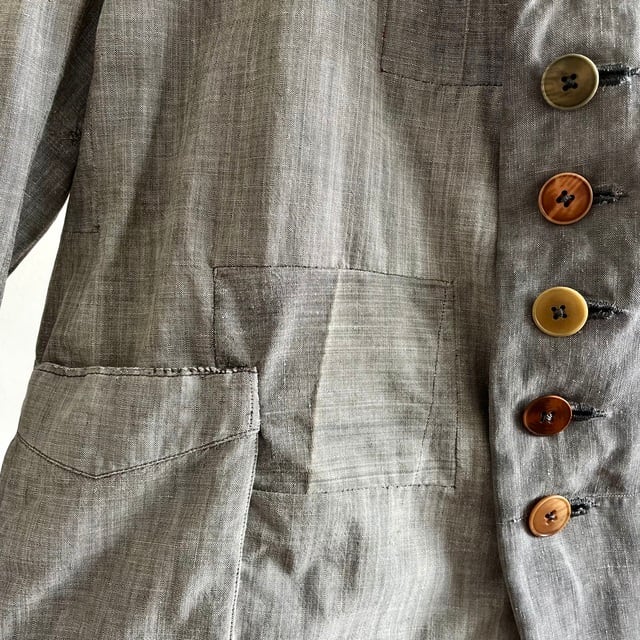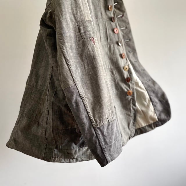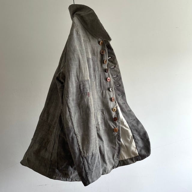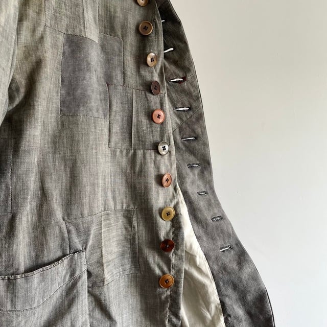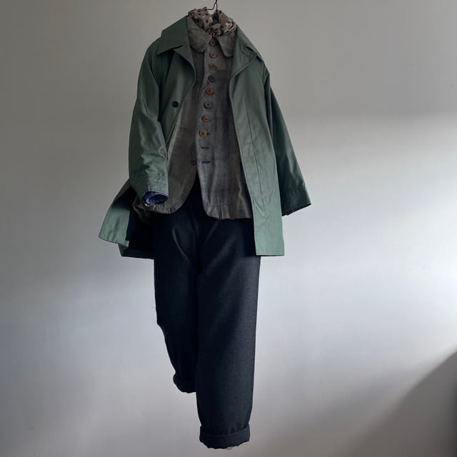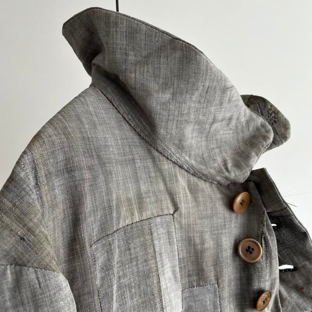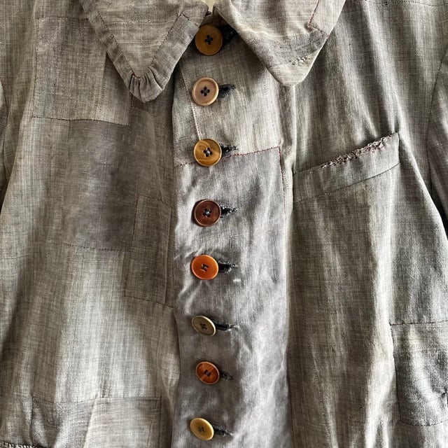 緯糸がブラックで経糸が白と黒のメランジ糸で織られ、白色と黒色が入り混じった色合いの生地からフランスで、“GRIS de Travail” (グレーの仕事着)と呼ばれるワークウエア。経てきた長い時間を取り込んだ風合いと、着込まれた涸れた色合いが深みを加え、愛用のしるしのダメージが辿ってきた時間を色濃く映し出す1着です。
