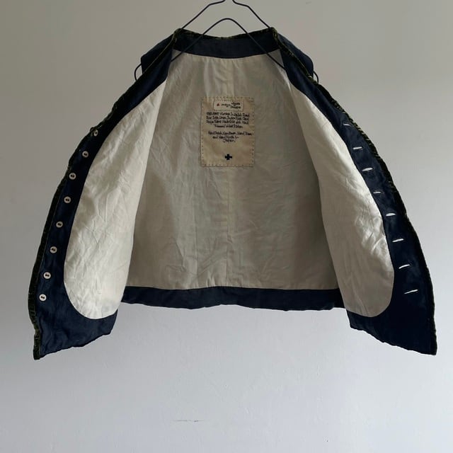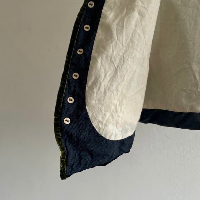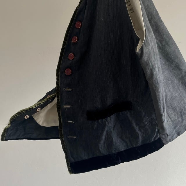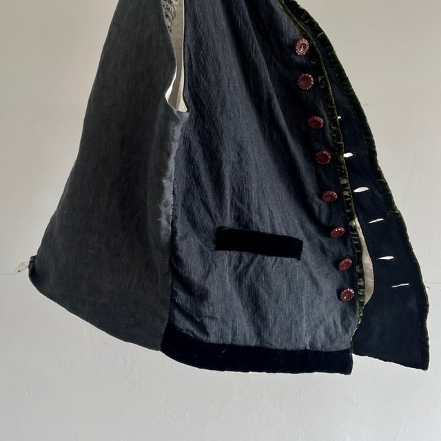 コンパクトな肩と身体に沿うフィット感のオーソドックスなGiletのフォルムに、ベルベットのアクセントを加えた1枚です。名前だけのアイリッシュリネンしか存在し無い今の唯一「本物」の「アイリッシュリネン」を手にする方法のヴィンテージのコードストライプのリネン生地。