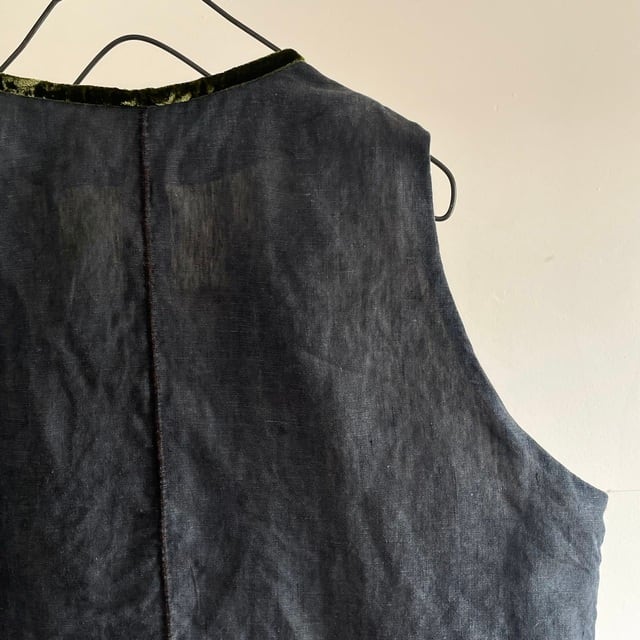 Vintage India-Ink Dyed Pure Irish Indigo Dyed Linen Cord Stripe Fabric Made Gilet with Hand Trimmed Velvet Ribbon | nestofmanure